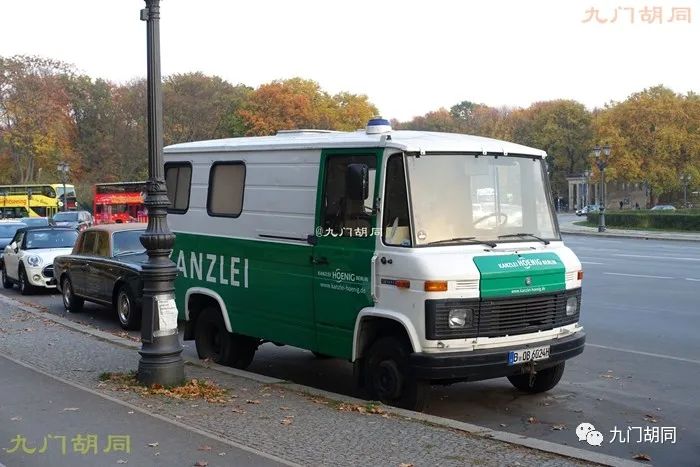 附近有路边收费停车场,一辆奔驰老爷面包车,已经很少见了,上面的广告是一家主要涉及交通法的律师事务所。看来这车就是用来吸引眼球打广告的。