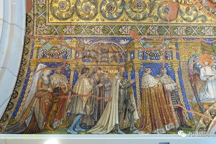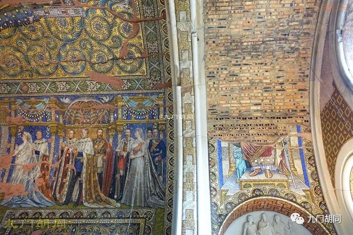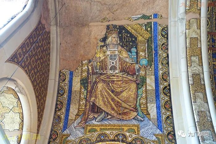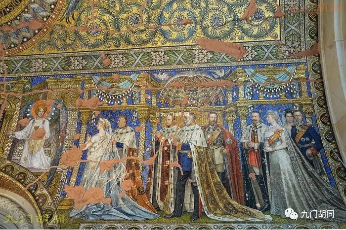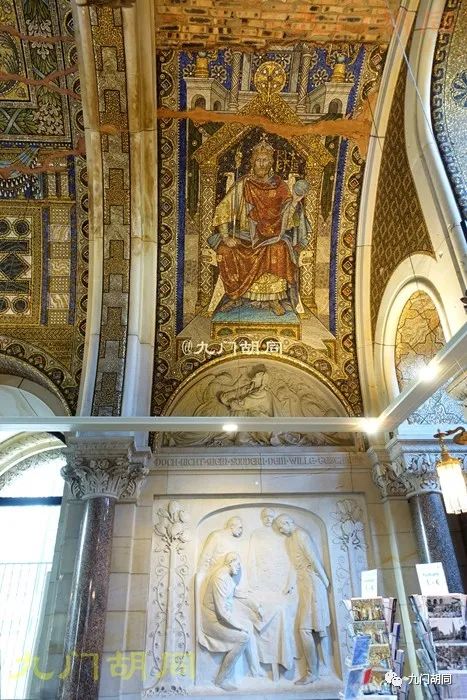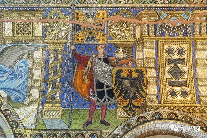 内部最大的特点是屋顶精美的马赛克镶嵌画,当初面积达2700多平米。马赛克是由柏林的一家玻璃及马赛克工厂制作的。绘画的主题以君权神授为主。https://p9.toutiaoimg.com/origin/pgc-image/b77788b868f14f54a57d7f6e7ac226ec
