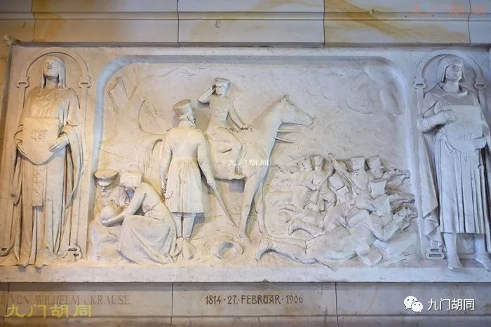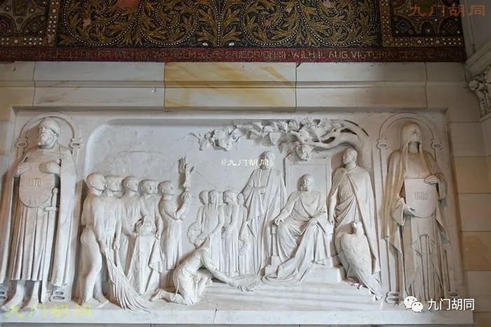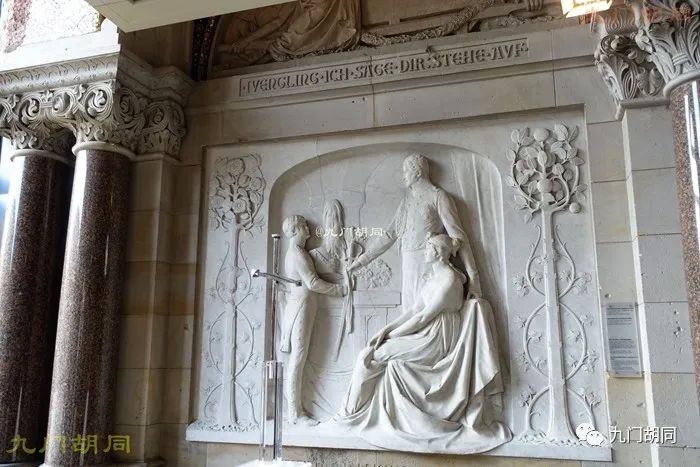 除了马赛克壁画,还有一些与霍亨索伦家族及德国统一战争有关的浮雕。这幅两侧有1797-1813的年代标记,可能是指威廉一世的父亲,普鲁士国王腓特烈·威廉三世(Friedrich Wilhelm III,1770-1840),1797是他继位的年份,1813是莱比锡大会战的年代,也就是拿破仑开始走下坡路的开始。所以这组浮雕估计可能是莱比锡大会战的场景,普鲁士是(第六次)反法同盟一方。骑马的可能是布吕歇尔,在向普王敬礼(仅是本人推测而已)。https://p5.toutiaoimg.com/origin/pgc-image/f5507ef6c40d4ad1801ab1f522e59361