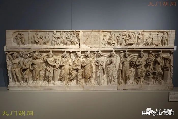 下面这个大理石石棺被发现于罗马阿皮亚大道,年代约在公元200年。上面的浮雕全是希腊神话中的神,如阿波罗、雅典娜(密涅瓦)和九位缪斯女神等。