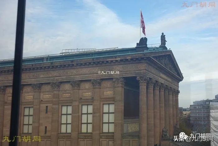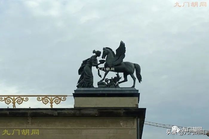 从新博物馆看旧博物馆后面屋顶上的雕像。正面的是双胞胎兄弟卡斯托耳和波鲁克斯驯马,背面的是什么不想去研究了,反正都与马有关系。