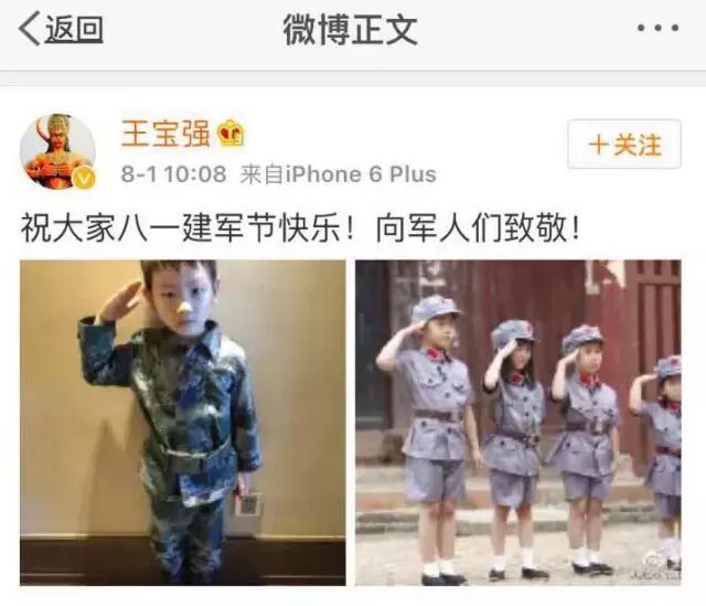 他写自己的孩子,不是在生日,也不是在六一儿童节,而是八一建军节,让孩子穿上迷彩服、穿上红军装,只为他祝福解放军节日快乐。