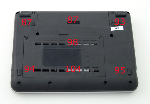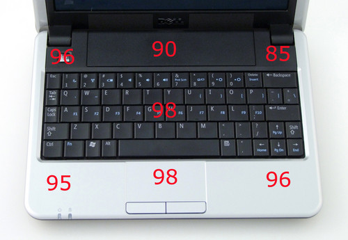 和所有其他测试过的超便携笔记本一样,Inspiron Mini 9超便携本在长时间使用后也会有些热。在通常使用条件下,比如网页浏览、文件、下载电子附件,Inspiron Mini 9超便携本的外部温度还比较稳定,也可以接受,最热部分是在无线网卡周围区域。下面标示的温度是在操作AVI影片和网页浏览三十分钟后的情况,单位为华氏。