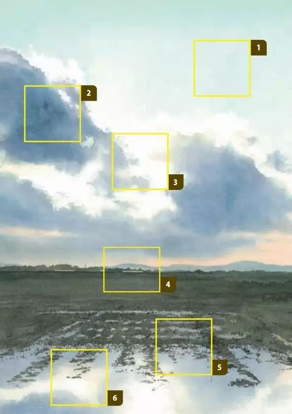 6,在风景画中经常会刻画倒映在水面上的天空。虽然没有必要必须完全一致,但是也要有意识地把握好形态。其中一个关键点就是以地平线为轴保持上下对称。