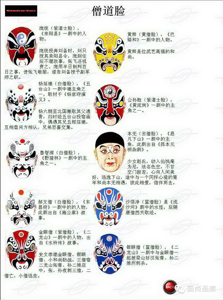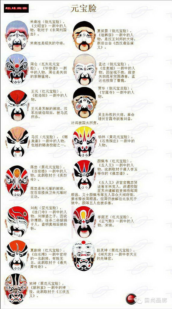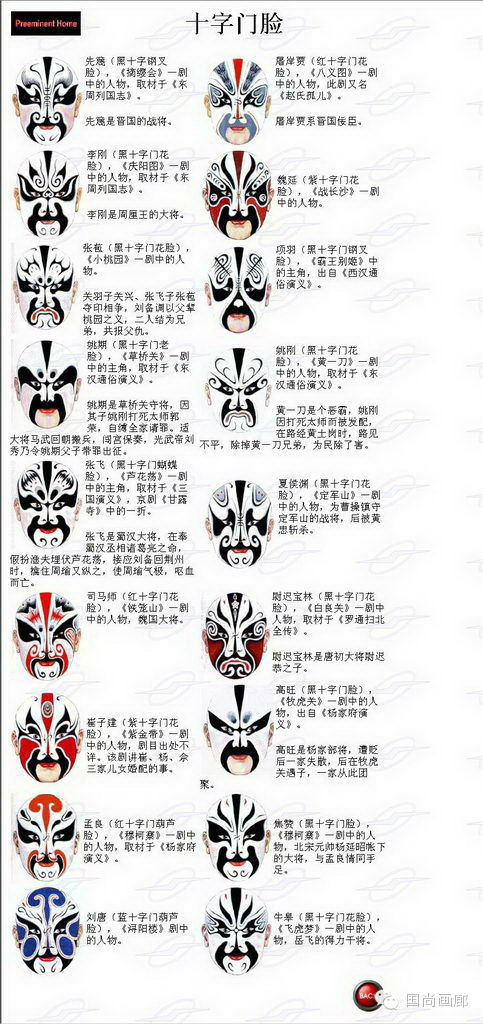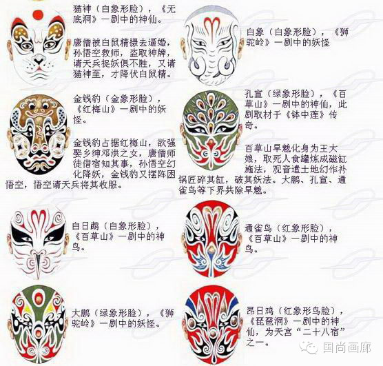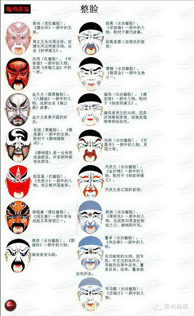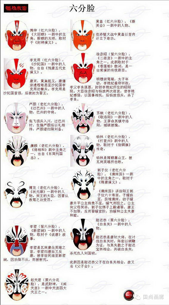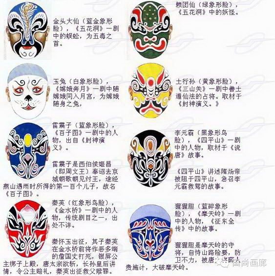紫色:表现骁勇、刚毅、正直、坚强、胆大。如杨延昭。 黑色:表现公正无私的,如包公;表现暴躁、鲁莽、耿直的,如张飞。 白色:大多表现阴险、狡猾、居心叵测。如赵高。