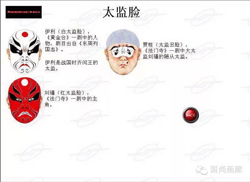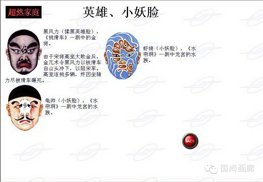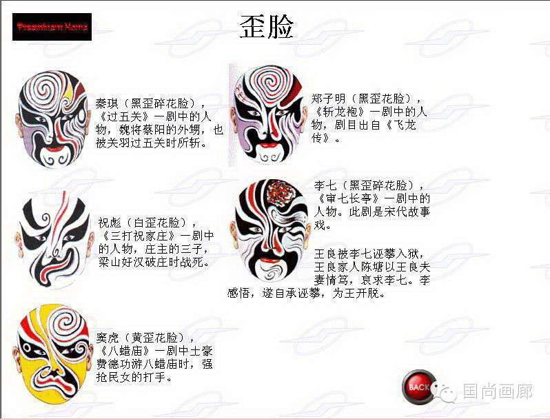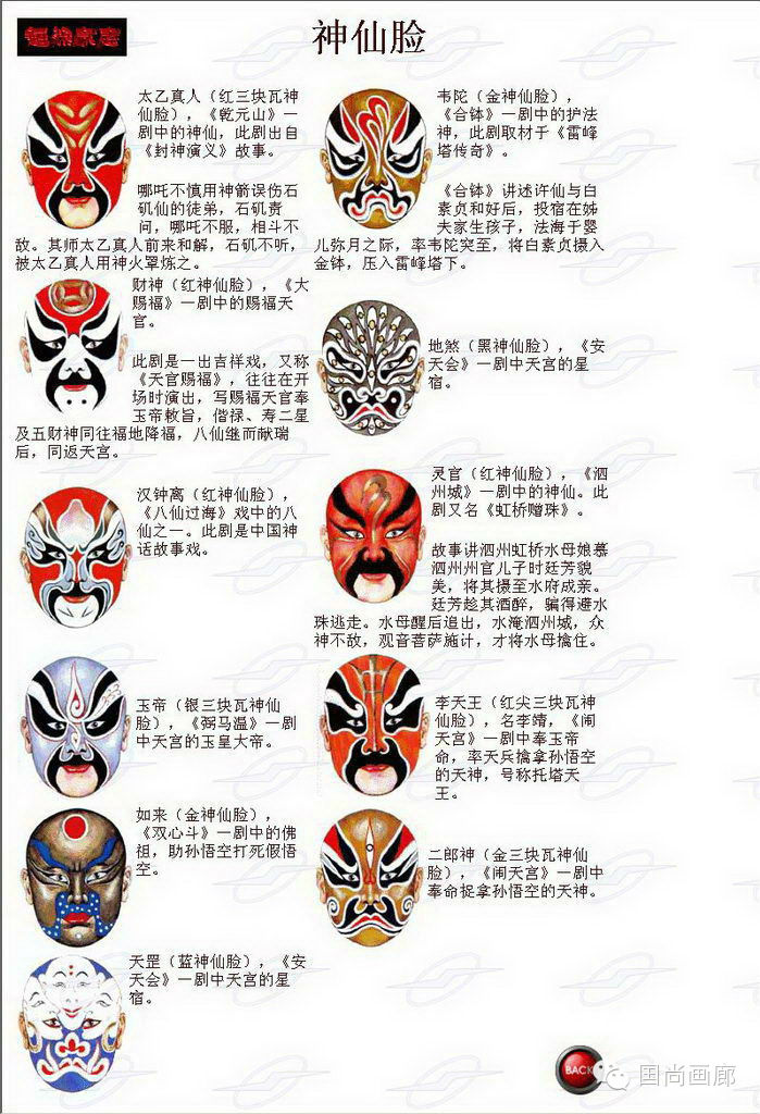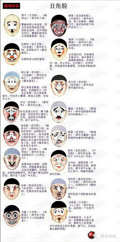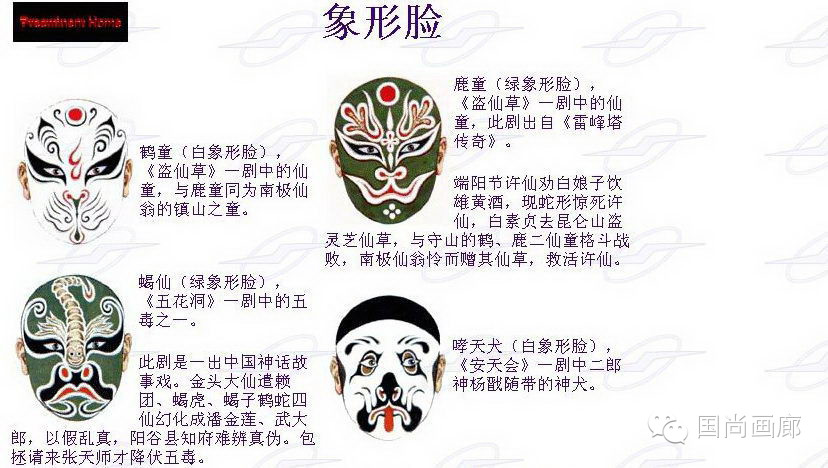紫色:表现骁勇、刚毅、正直、坚强、胆大。如杨延昭。 黑色:表现公正无私的,如包公;表现暴躁、鲁莽、耿直的,如张飞。 白色:大多表现阴险、狡猾、居心叵测。如赵高。