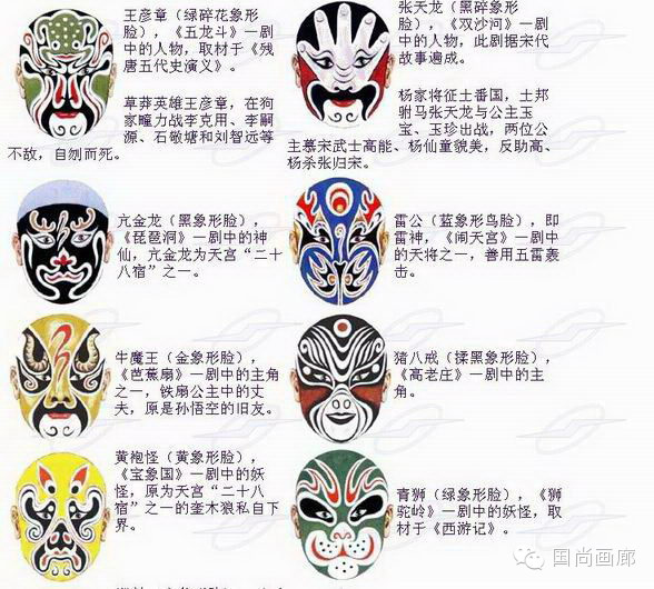 黄色:一般表现性格猛烈。如《南阳天》中的廉颇。 褐色和粉红色:表现比较正直的老人。