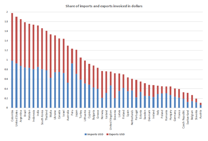 许多国家 (除了美国) 的贸易中有很大一部分是以美元计价的。它们往往是拉丁美洲和亚洲的新兴市场,但也包括加拿大等相邻国家。欧洲国家主要是以欧元计价,其中一些国家使用的是本国货币。总体而言,美元在全球经济中具有明显的主导地位,而欧元是欧洲重要的区域性结算货币。