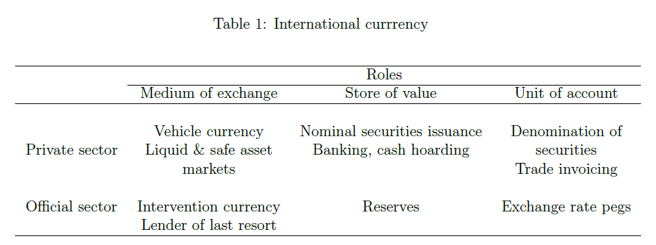 表1总结了国际货币在私人部门和公共部门的不同作用。在下面的子节中,我们将更详细地讨论这些不同的角色。