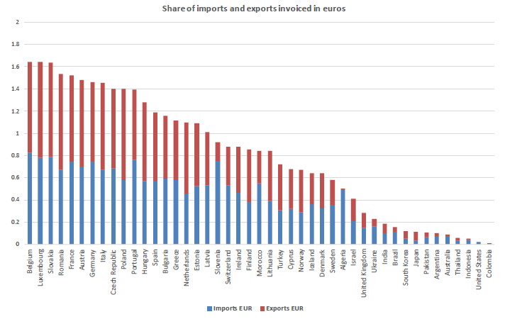 注:我们保留了所有国家的进出口数据。唯一例外的是第二张图中的美国,因为不存在美国出口的欧元份额。