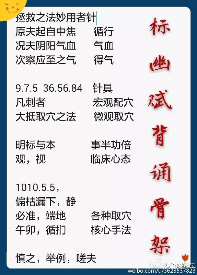 如果说你真的很喜欢针灸,想从标幽赋入手的话,我建议吧,还是手抄三遍,抄三遍之后听着我的录音,把它的主要脉络捋清楚,捋清楚的同时你再听的话就非常轻松了,其实标幽赋分为这样几个阶段,