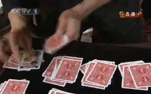 刘谦的魔术表演时虎年春晚的一大亮点。但网友发现,在他表演的扑克魔术中,有明显的穿帮镜头。董卿洗完牌交还给刘谦的时候,刘谦继续洗牌,这一过程中,镜头中明显可以看到,一摞纸牌中有一张牌牌面朝上。网友说,这很可能是用来作为标记的一张牌。