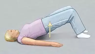 病人位置:病人屈髋屈膝位仰卧,让病人在抬起和下降骨盆时,注意维持正常的脊柱位置。以等长运动方式维持桥式。
