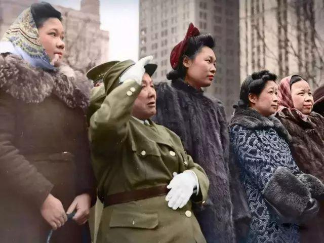 1943年,在路边迎接宋美龄的人群中,有一位身穿军装戴着白手套的华人,他在看到宋美龄的车队后敬了一个军礼。