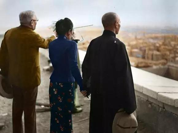 1943年11月27日,蒋介石宋美龄夫妇手牵手,站在开罗某处的楼顶俯瞰整个开罗城。