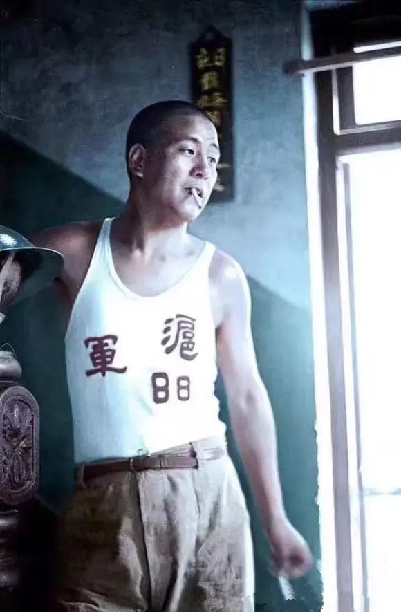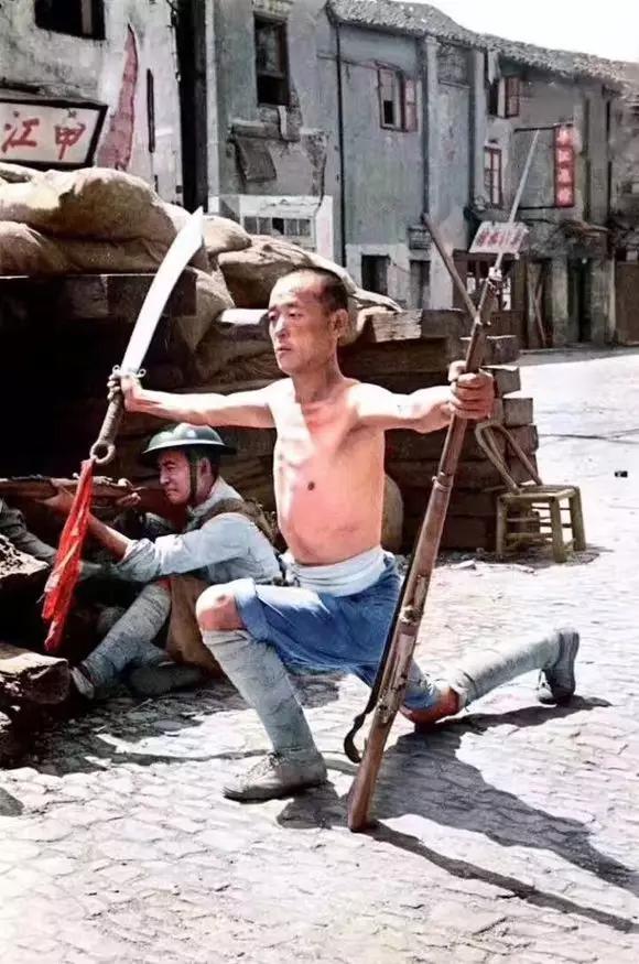八·一三淞沪会战期间,一士兵在街头锻炼。