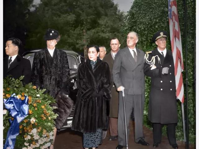 1943年2月22日,宋美龄坐在一旁,美国总统罗斯福在白宫向全美人民发表讲话纪念美国第一任总统乔治·华盛顿210年诞辰。坐在罗斯福桌旁从左至右分别为:玛拉·迪·佐普拉,她是罗斯福总统的一位亲戚;哈瑞·霍普金斯,他是罗斯福亲密的朋友和顾问,宋美龄访美也是由其一手促成。