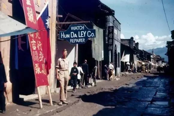 驻芷江的美军通讯兵约瑟夫在芷江南街钟表店前留影。