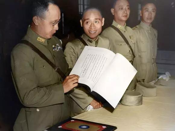 1945年9月9日,何应钦将军检视受降降书,指着受降书上日军将领冈村宁次签字盖章的地方。
