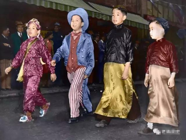 1943年4月,在欢迎宋美龄一行抵达旧金山市的游行活动中,四位小朋友走在队伍中间,其中两个小朋友穿着传统的中式长衫戴着瓜皮帽,还有一个小朋友扮成“山姆大叔”的模样,充满了自豪与自信,这种中美混合风也是旧金山市唐人街生活的写照。