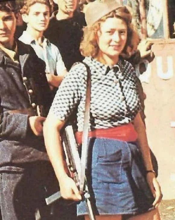 这是一名风情万种的法国女游击队员,诺曼底登陆之后,大批的反抗军出现在巴黎街头,图中漂亮的女生留着波浪卷,身上的白格子衬衫,腰间系着红色长条,下身蓝色裙子,这不是象征着法国国旗吗?