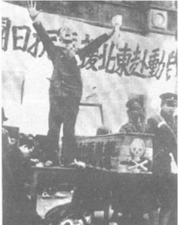 9、赴东北援马抗日团上海青年300多人组成的“赴东北援马抗日团”。张少杰团长在火车站向欢送人群致诀别词:“除非我们死,我们决不回来!(注意旁边的棺材)