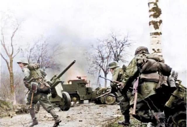 照片拍摄于1944年末,此时德军在阿登突击战中取得一定成功,但由于种种原因,德军优势无法扩大,最终导致大批德军被盟军士兵包围,图中一直德军小队快速穿越马路,一旁美军车辆正在燃烧,此时,希特勒的千年帝国也即将覆灭。