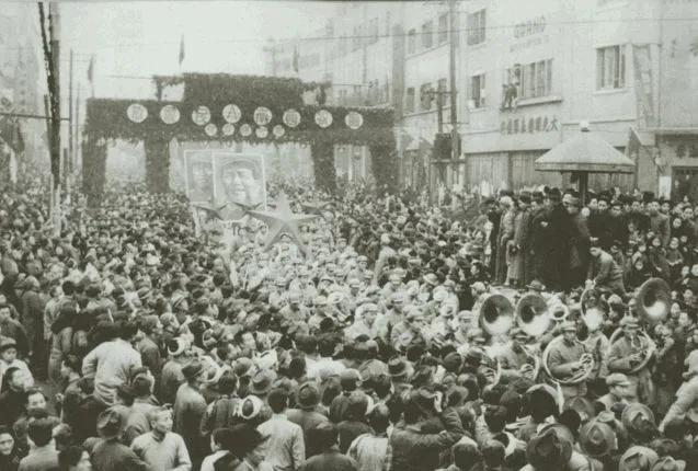 全国解放战争胜利。欢呼的人群走向街头为人民解放军送行。队伍中由军乐队开道,从照片中似乎依然可以听到那嘹亮的号角。巨大的主席像在人们的拥护下随着队伍浩浩荡荡穿街而过。