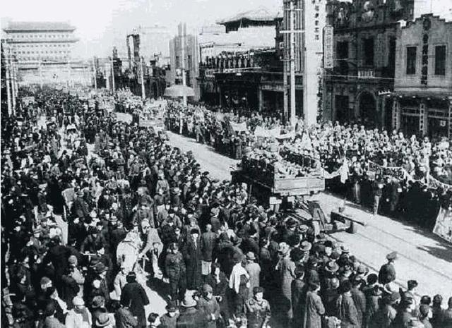 北平解放,解放军的军车徐徐前行,车身后面拉着大炮。街道两旁有成千上万的群众在围观。那时候人们的服侍还是多以长袍为主。