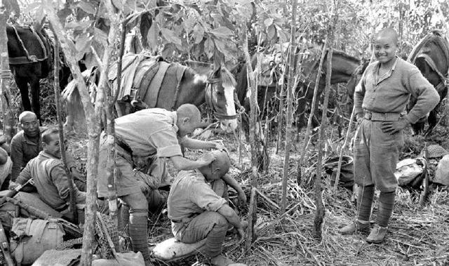 【在野人山密林中短暂休息】野人山曾让无数远征军谈之色变,当年从野人山走出来的老兵晚年回忆时说:“你就是把靴子扎得再紧,壮硕的蚂蝗也能钻进去,一觉醒来,蚂蝗都胀死了。那里的蚊子特别大,被蚊子咬过后就会发烧。都是毒蚊子。”