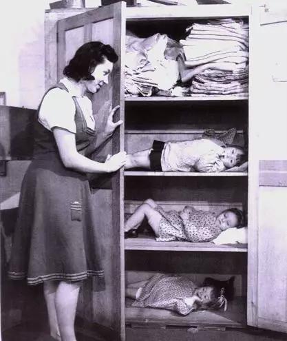 二战期间,物资极度匮乏。因此每一件东西都可以被利用起来,托儿所的衣柜已经被用来当做孩子们午休的暖床。