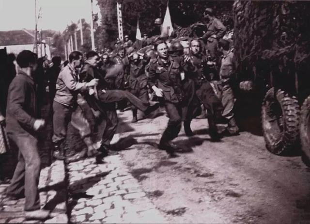 1945年,法国巴黎。一名法国人看见一名德国战俘时,怒由心生,起脚便踢。