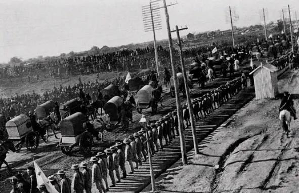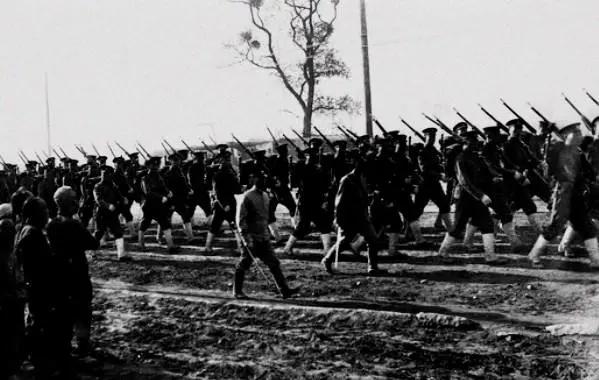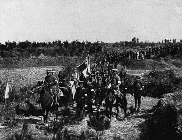 新军在辛亥革命中的表现就证明了新军是一把双刃剑。图为步兵军团在军官的率领下列队前往营地。