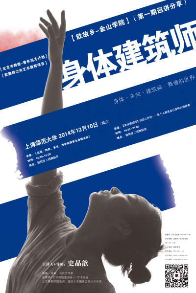 【歆故乡·金山学院】巡讲第七站:上海师范大学 精彩分享" TITLE="歆分享 | 【歆故乡·金山学院】巡讲第七站:上海师范大学 精彩分享" />歆舞界全家福,摄影:靳伟强 歆舞界作为中国特立独行的艺术机构活跃存在着,致力于东方当代舞蹈精神的探寻、建立与传播,力求在传统与当代的语境中向过去、现在、未来取材,探寻身体叙事的现代性,建构以身体为主的表演形式的多元性。主张独立制作发表作品:2009年《圆明园》、2010年《面具的世界》、2011年《觉》、2012年《活着就好》、2013年《双城》、2014年《空性之舞》;并于2013年开始推出公益艺术展演,旨在让更多人可以走进剧场观看当代舞蹈:2013年《活着就好》(1月上海)、《阿O一家》(9月北京)、2014年《HI—朱丽小姐》(5月北京)、《双城》(9月北京)。同时歆舞界致力于公共艺术教育项目的推广与分享,即2009年展开歆舞界“点-线-面”(IN -BETWEEN)高校艺术活动系列之后继续致力于公益传播中国当代舞蹈艺术,于2013年展开歆舞界【身体建筑师】“零-动点”训练方法(Body Architect)演讲及工作坊系列等公共艺术活动受到业内与公众的好评。