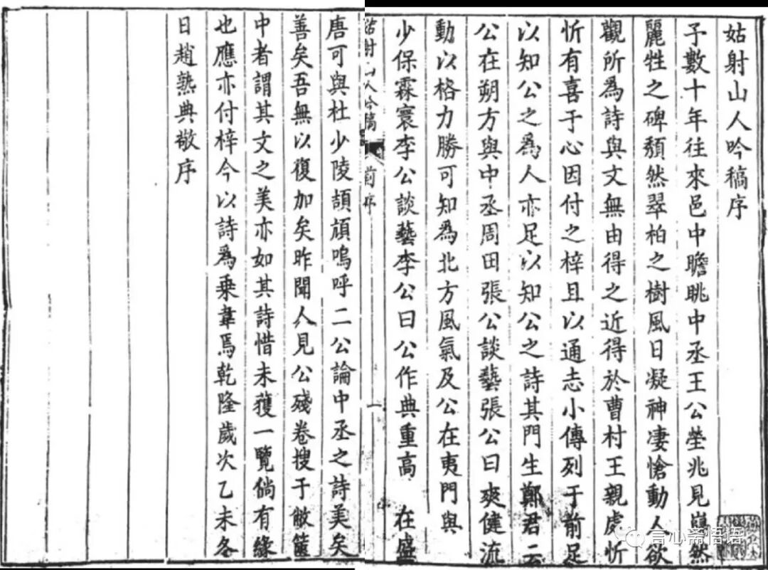 予数十年往来邑中,瞻眺中丞王公茔兆,见岿然丽牲之碑,颓然翠柏之树,风日凝神,凄怆动人,欲观所为诗与文,无由得之。近得于曹村王亲处,忻忻有喜于心,因付之梓,且以通志小传列于前,足以知公之为人,亦足以知公之诗。其门生郑君云:公在朔方,与中丞周田张公谈艺,张公曰:爽健流动,以格力胜,可知为北方风气。及公在夷门,与少保霖寰李公谈艺,李公曰:公作典重,高在盛唐,可与杜少陵颉颃。呜呼!二公论中丞之诗美矣善矣,吾无以复加矣。昨闻人见公残卷搜于敝箧中者,谓其文之美亦如其诗,惜未获一览。倘有缘也,应亦付梓,今以诗为乘韦焉。乾隆岁次乙未(1775)冬日赵熟典敬序。