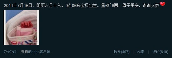 刘烨在微博透露太太安娜产下一女。刘烨字里行间透着浓浓的温馨,对女儿的怜爱一览无遗。而姚晨的微博则透漏了更多的信息,‘除夕夜,喜得千金,六斤五两,取名霓娜。’http://img.itc.cn/photo/orhDZacmXej李念晒“小龙女”——Jessica*水瓶座