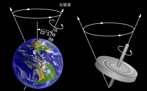 如果你转动一玩具并看它顶部,它围绕旋转的那根自转轴其实指向不同的方向,自转轴在移动,这就是我们所说的岁差。对于地球,现在这根自转轴指向的是北极星,但是公元前3000年地球这轴指向的是却是右枢(thuban),这个逐渐的变化经历了26000年。