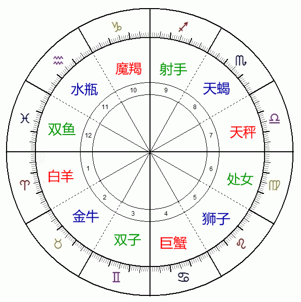红色的四个是基本宫星座,蓝色是固定宫星座,绿色是变动宫星座。