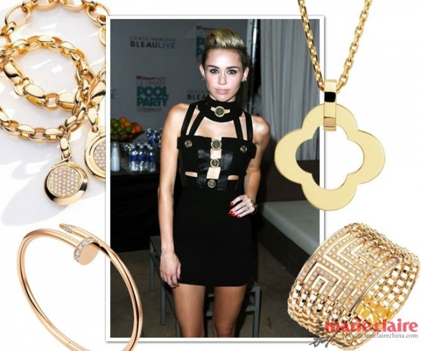说道金色系的珠宝,人们的第一反应一定是老气,其实不然,金色珠宝与黑色礼服,可以堪称是绝佳的组合,如果你向往高贵优雅的气质,那金色与黑色一定是完美的搭配。但是,在好莱坞有一位90后的小甜心,总是可以把金色珠宝演绎出酷感十足的摇滚野性味,她就是麦莉·赛勒斯
