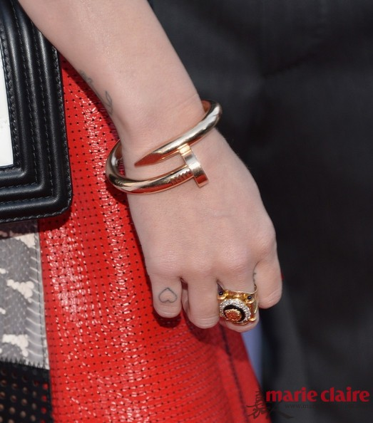 Cyrus的珠宝佩戴中,总少不了耀眼的金色配饰,不对称耳环,金属项链、手镯,金色腕表,清一色的金色系列珠宝首饰,成为她得最爱,并且这些金色珠宝完全没有老气的感觉,呈现出了反差极大的摇滚风,如果你还对金色珠宝有偏见,那就来看看Miley