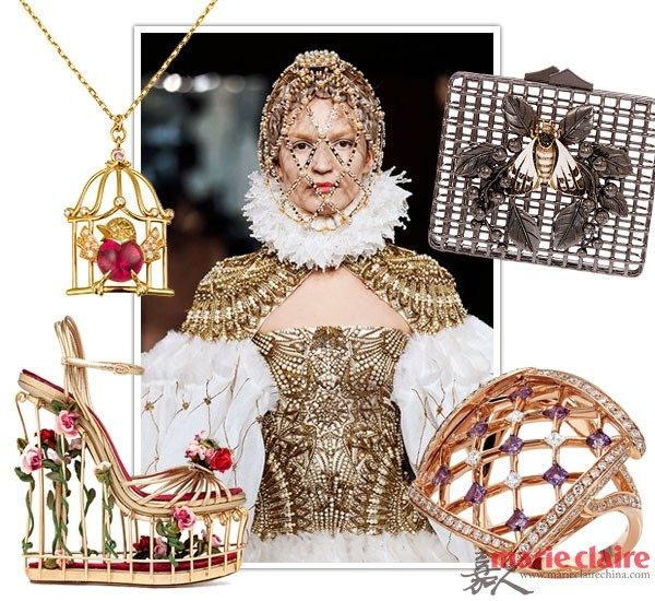 在2013秋冬Alexander Mcqueen的秀场上,我们看到了具有中世纪英国宫廷的极端美学风,每一位模特都戴着珍珠镶嵌的华丽头罩,仿佛中世纪的王室贵族一般。然而,这种“网状式”风格似乎成为了今天金属配饰的新玩法,除了头罩,你还可以在珠宝、手包甚至是鞋履上,都可以见到。金属的硬朗质感,通过搭配不同的元素,可以让单品呈现出哥特味十足或巴洛克主义的华丽风格。奇思妙想的设计,也让大牌单品多了一丝新颖感。