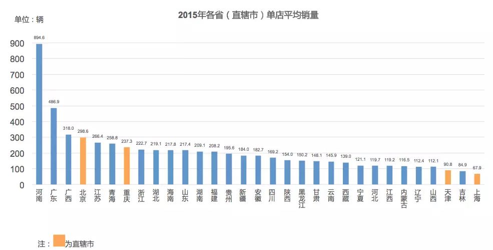第三,我们从销量和网点数的对比中,发现了一个更具有意义的排名:单店平均销量排名,这个排名是切切实实反应每一个省每一家经销商销售和管理能力高低的,是一个以店为单位的平均销售量排名,也是真正的销售能力的展现,从这个排名中我们发现人口大省河南省遥遥领先,单店销量近900台/年,排名第二则是广东,而排名末尾的是上海,但我在上海的道路上还经常看到五菱和宝骏的车开过,也许这些车是那些进城发展的人们在上海打拼发展的工具,只是挂的非上海牌照而已。