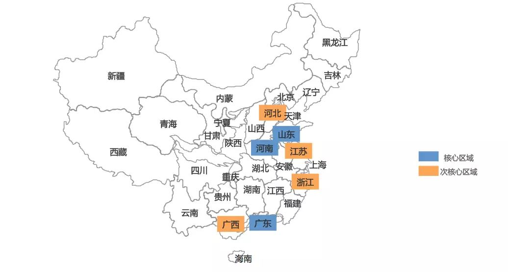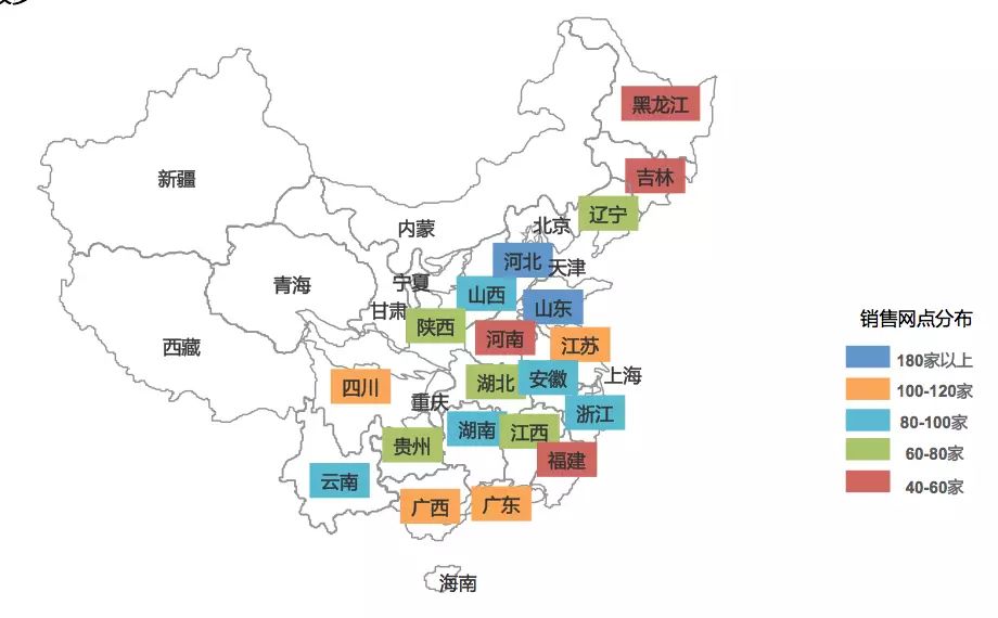 其次,我们将上汽通用五菱的经销商网点按照省份在中国地图上做个整体的呈现,可以清晰的发现中“左轻右重”经销商网点全国布局图,前两位的经销商分布在河北和山东,3-6位的江苏、广东、广西和四川的分布则比较的分散。