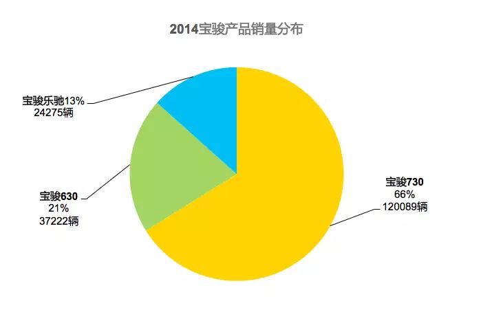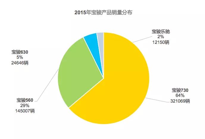 这里为大家单独呈现2014年和2015年宝骏品牌的销量分布,可以发现宝骏730成为宝骏品牌的销售顶梁柱,销量占比都超过了60%,但是从整体销量中我们可以看到宝骏品牌销售结构的均衡之美,2014年的630到2015年的560,都很好的平衡了宝骏品牌的销量结构,66%、64%,跟黄金分割是巧合?还是五菱人的控制?我们不得而知,唯一可以确定的是:在当下宝骏的成功是难以超越。