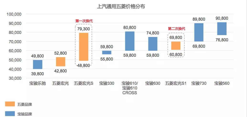 谈完了产品线,我们来看看上汽通用五菱的价格定位,从整体看,没有一款产品的价格超过10万,甚至我们可以更精细地看到最高定价仅仅是超过9万一点,但是在9万以下的价格区间里,上汽通用五菱是精确布局的,五菱品牌从3万多开始,而宝骏品牌确是从5万多开始起价,无形中就形成了五菱和宝骏的价格差异化竞争,同时又可以看到销量王宏光的价格跨度从48800元到79300元的设计是更多的满足市场需求,宝骏730和560的整体定价都是在近7万的水平上开始,通过价格策略我们发现上汽通用五菱逐渐释放品牌溢价能力的精准把控力,充满了稳健,而不是急于去扩张,这一点值得国内很多品牌思考。