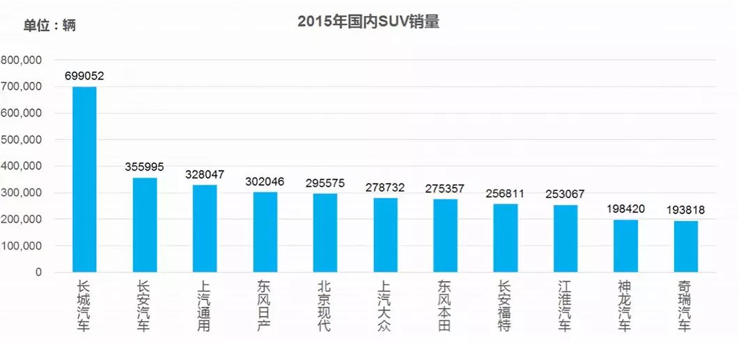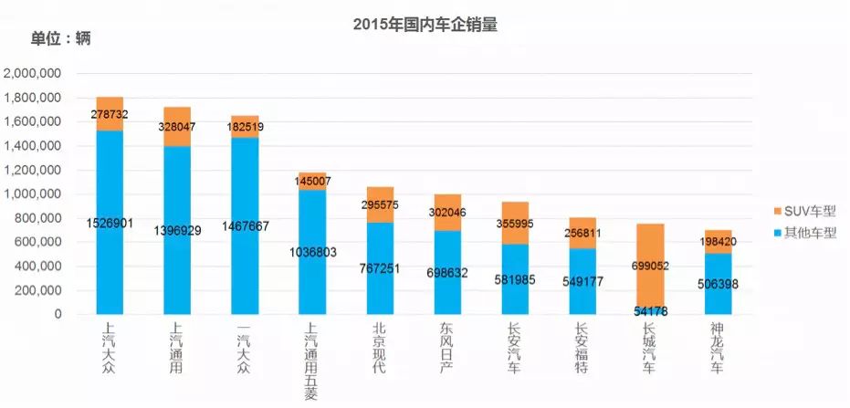 在上汽大众收获180多万销量的傲人业绩下,SUV在他整个销量中的占比刚好超过15%,紧随其后的上汽通用和一汽大众业绩双双超过160万,SUV的占比也未超过20%,但是有这么家企业,几乎完全靠着SUV的销量跻身销量前十,他就是长城汽车,整个SUV的销量在2015年将近70万辆,真是成也SUV危也SUV。