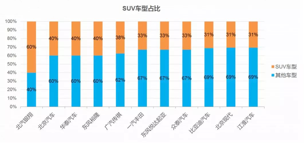 将长城作为特例,从SUV销量占比的排名中剔除后,我们发现北汽银翔的SUV销量占比居然超过一半,达到了60%,他们首先推出的幻速车型,就包括两款SUV。在这一个统计表格中,前10位的SUV销量占比都超过30%,这是一个令人深思的现象,企业将如此多的资源押宝在SUV市场,寄望于SUV的持续爆发力,不知是否是长久之计。