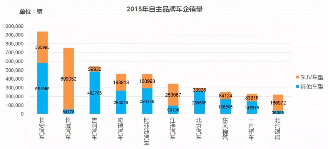 2015年长安汽车的销量超过了90万辆,这是一个具有里程碑意义的数字,在即将达成百万销量的关键时刻,长安多点开花,但无疑SUV是他的重中之重,占整体销量的38%还多,在自主品牌前10中,吉利汽车的SUV销量占比最小,但是随着全新博越的上市,吉利发力SUV市场的意图非常明显,奇瑞和比亚迪同样依靠SUV战略将自己的排名保持在了前五名。可以说,当前没有SUV做王牌车型的自主企业,很难立足车市。