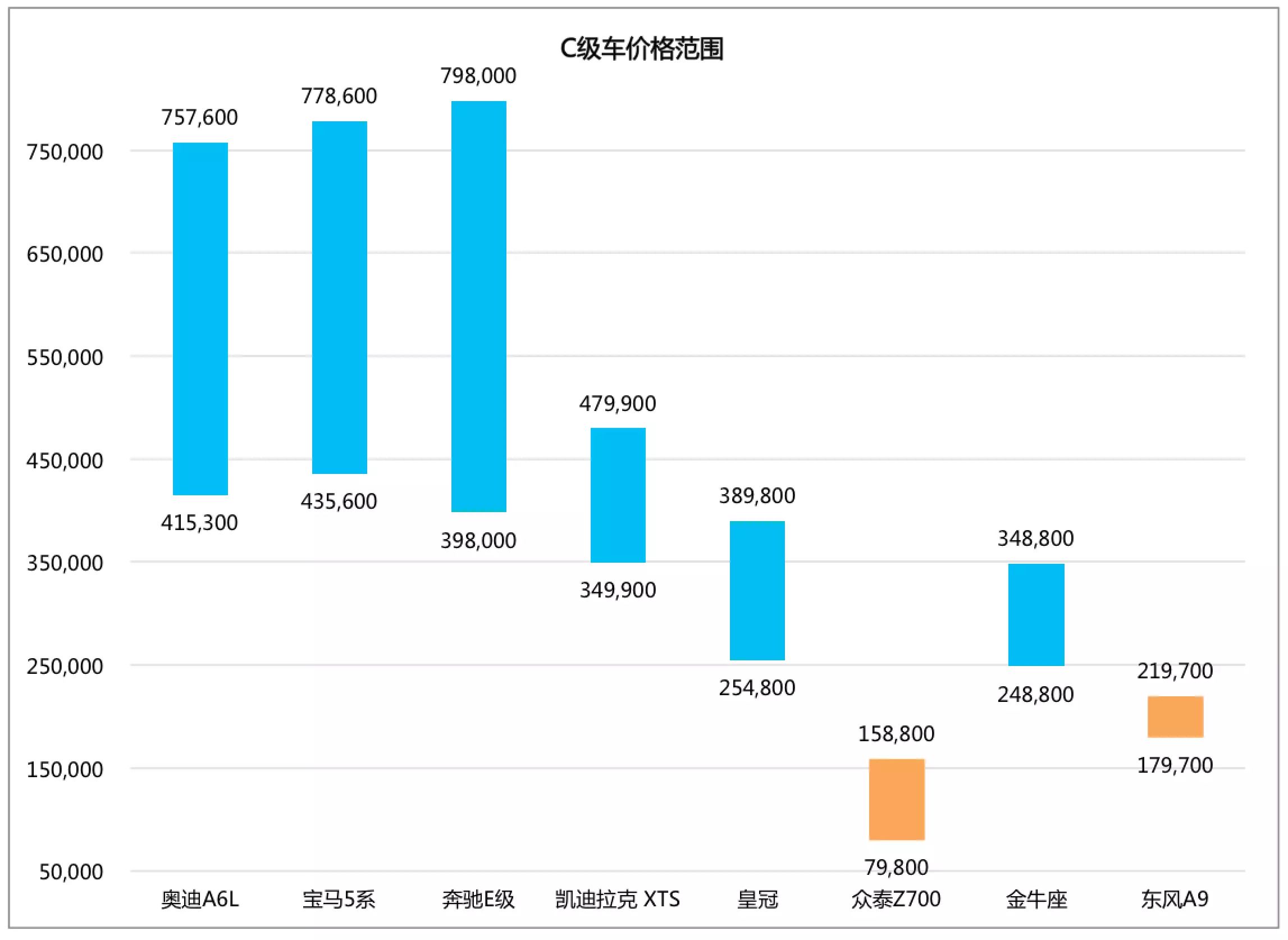 C级车这一以尺寸定义的细分市场,由于豪华车品牌BBA(奔驰、宝马、奥迪)的长期把持,在中国似乎形成了一种“身份准入”,对目前在售的C级车价格进行梳理后发现,存在三大阵营:第一类就是传统的C级车三强:奥迪A6L、宝马5系、奔驰E级,售价基本都在40万以上;第二类是作为后来者的凯迪拉克XTS、皇冠、长安福特金牛座,价格集中在20-40万,最高的凯迪拉克顶配接近50万,当然这一类还能再分,包括皇冠这样后继乏力的老资格,以及挑战高端遇阻的金牛座;最后一类是意欲挑战高端的自主品牌东风A9和众泰Z700,这一类既有顺应公车改革的需求意味,也有盲目拔高、不切实际的风险。
