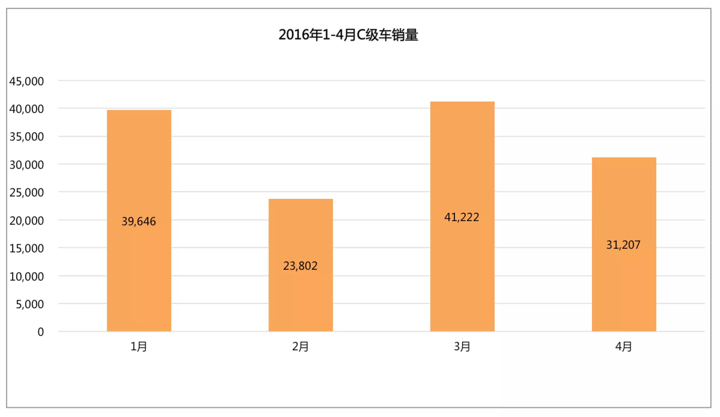 2016年1-4月整个C级车的销量呈现出W型的跳转式发展,3月是月度销量高峰,2月在前4个月垫底,销量只超过了23000台。